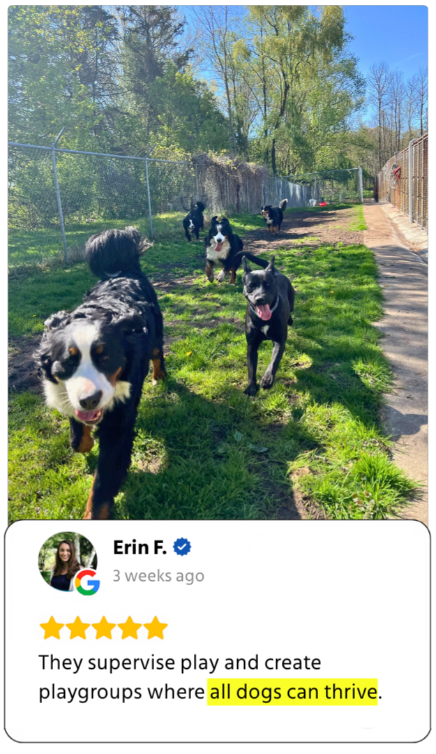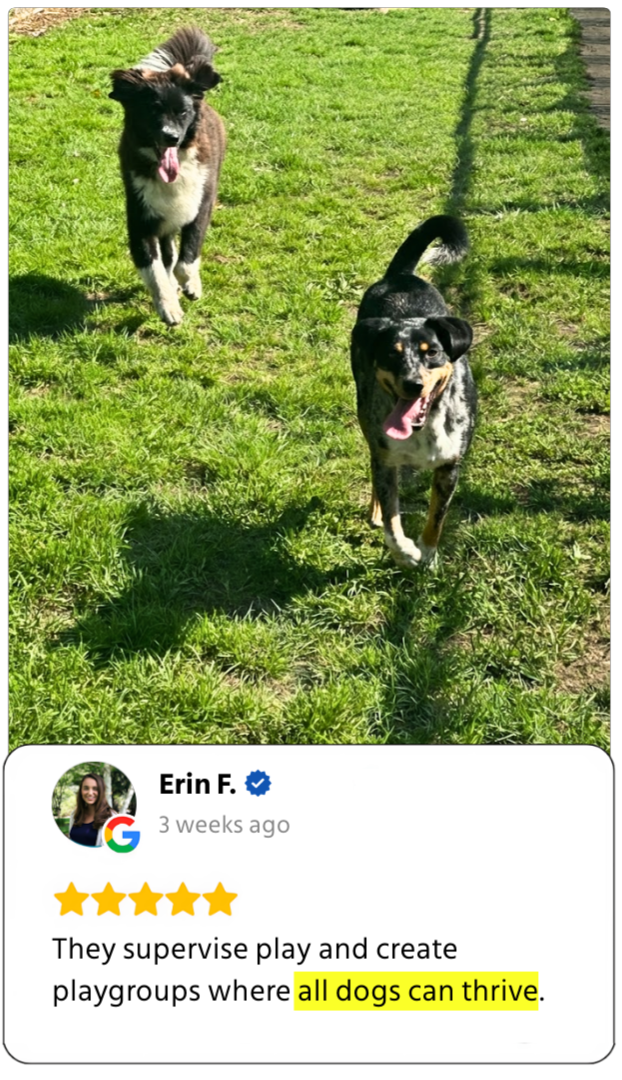 Daily Personalized care with one-on-one playtime or small-group sessions (2-6 dogs in a group) - whatever your pup feels most comfortable with.